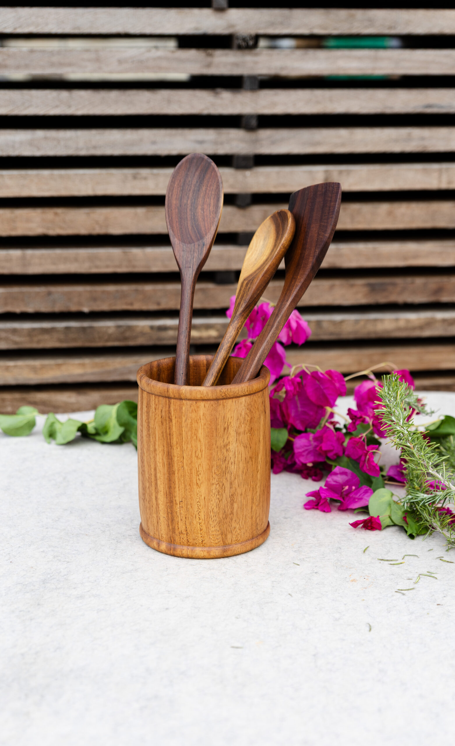 Handcrafted NG Rosewood utensil holder made from a single piece of solid timber, designed to neatly organize kitchen utensils and add natural warmth to your kitchen.